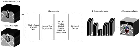 To facilitate the extraction of features within the CT scans, the datasets underwent several enhancements (Figure 2A), including window setting adjustments, isotropic voxel reconstruction, contrast-limited adaptive histogram equalization (CLAHE), and region of interest (ROI) cropping. The preprocessed images were used to train the segmentation model (Figure 2B) to produce segmentation results (Figure 2C). The overall training process is presented in Figure 2. A bone window with a width of 2,000 and a level of 0 was set and converted into 8-bit encoding. This setting has been established as the imaging technique of choice for examining patients before functional endoscopic sinus surgery [15,16].