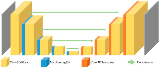 The U-Net architecture is commonly used for medical image segmentation models because of its reliable performance on medical images [24,25,26]. Furthermore, its utilization of depth-wise 3D convolution operations allows for the simultaneous extraction of features along the 3 axes: axial, sagittal, and coronal. Three variants of the 3D U-Net architecture, each deeper than the last, were trained and compared: 3D U-Net with residual connections [27], 3D U-Net with dense blocks [28], and 3D U-Net with dense blocks and residual connections [29]. The 3D U-Net architecture, which served as the basis for constructing our model, is presented in Figure 3.