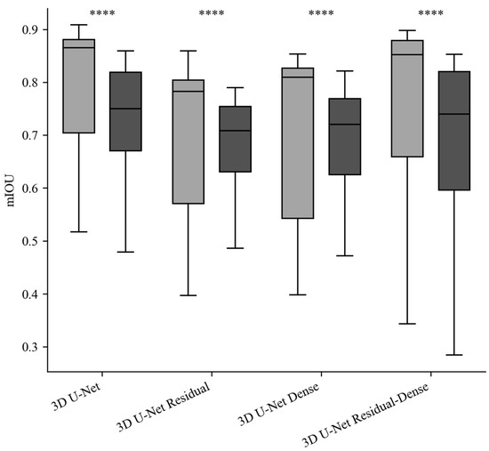 mIoU comparison of each model in the normal and abnormal test set (gray: normal dataset results, black: abnormal dataset results, ****: statistical significance (p < 0.05)).
