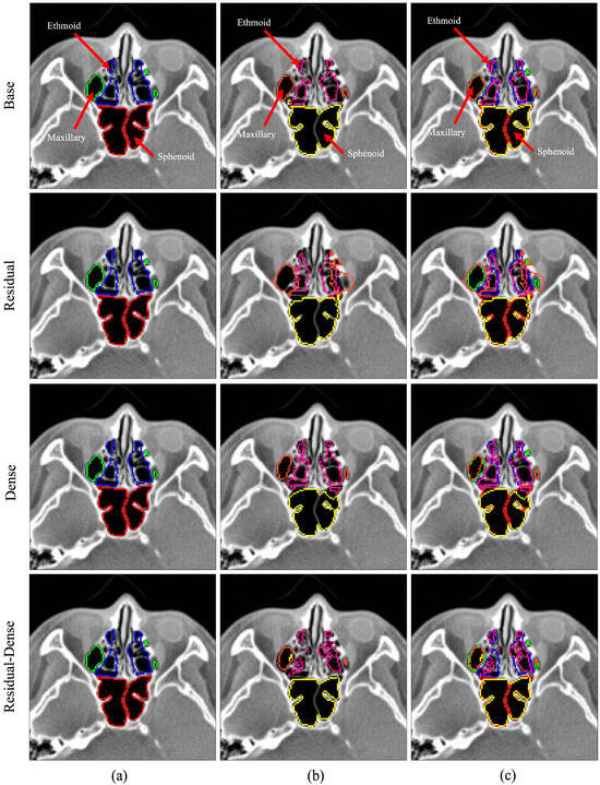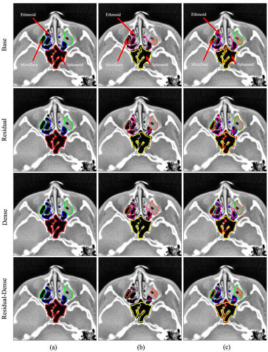 Artificial intelligence is gaining popularity in the medical imaging field for developing models that produce human-interpretable results [8,9,10]. Because of the clustered arrangement of regions, including the frontal, ethmoid, and sphenoid sinuses, developing models that can produce practical results for the paranasal sinuses is an ongoing challenge. Two published studies focused on processing cone-beam computed tomography images to achieve segmentation of the maxillary sinus. In 2022, Choi et al. [11] trained a U-Net model to segment maxillary sinuses. The segmented results were refined using post-processing techniques to isolate and remove disconnected false positives. The trained model made predictions with a Dice similarity coefficient (DSC) value of 0.90 ± 0.19 before post-processing and 0.90 ± 0.19 after post-processing. Morgan et al. [12] trained two U-Net models to segment the maxillary sinus. The first model suggested crop boxes in the original image of the maxillary sinus, which were used to train the second part of the model to produce high-resolution segmentation results. The final segmentation results achieved a DSC score of 0.98 for the first model and 0.99 for the second model. Kuo et al. [13] proposed a 6-class segmentation model that segmented four different areas of the paranasal sinuses, treating the ethmoid sinus as two different areas: the anterior and posterior ethmoid sinus. A secondary model was trained to generate pseudo-labels on the unlabeled datasets. The model used in this study was an adaptation of the U-Net model [14] with the addition of depth-wise separable convolution, squeeze-and-excitation networks, and residual connections. The model was able to make predictions with a DSC value of 0.90. The approaches proposed by Choi et al. [11] and Morgan et al. [12] exhibited performance adequate for clinical applications. However, the aim of both studies was limited to the binary segmentation of the maxillary sinus.