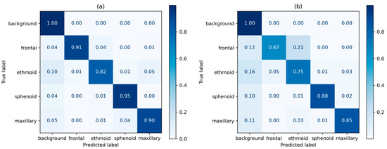 Normalized true positive (TP) distribution per class as a heatmap for the 3D U-Net is shown in Figure 6. For the normal dataset, the sphenoid sinus showed the highest TP rate of 0.95, whereas the ethmoid sinus showed the lowest at 0.82. For the abnormal dataset, the sphenoid sinus reported the highest TP rate at 0.88, and the lowest for the frontal sinus at 0.67.
