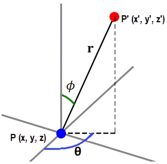 Illustration of perturbing a point P(x, y, z) in 3D space to a new position P′(x′, y′, z′) using spherical coordinates. The perturbation magnitude is represented by r, with azimuthal angle and polar angle .