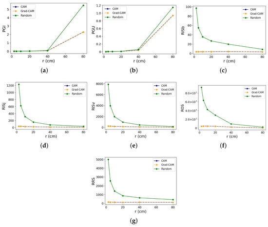 The identical PGI and PGU values for CAM and Grad-CAM mean both methods have the exact same ranking of features, although the numerical attribution scores are not exactly the same. Unexpectedly, the random method appears to outperform both in PGI in the weakest class, except at r = 80 cm. Conversely, looking at the results for the strongest class in Figure 5 suggests equal PGI performance among all methods up to cm, beyond which the random method seems to surpass the others. In essence, in a class where the model has the best classification performance, the PGI test aligns with expected outcomes only at higher values of r, where data distortion is significant, which is no longer consistent with the rule that . Moreover, where model classification is the weakest, PGI results consistently give unexpected outcomes. In class 32 (results shown in Figure A1), which has a classification accuracy of 91.67%, both CAM and Grad-CAM outperform the random method in terms of PGI, albeit with a small margin. Conversely, in class 9 (results shown in Figure A2), with a classification accuracy of 80.95%, CAM and Grad-CAM also outperform the random method across all perturbation magnitudes, except at cm.