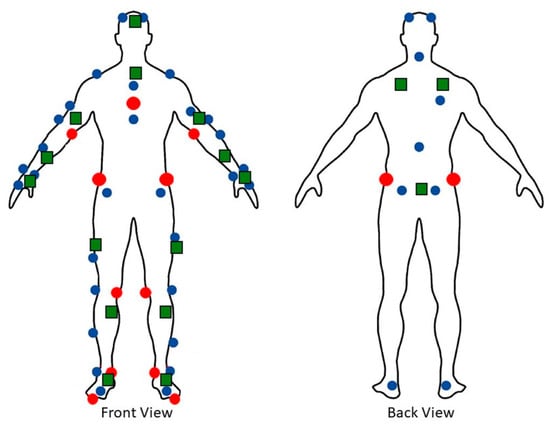 Full-body participant set-up, adapted Plug-in Gait marker set, and IMU sensors, with regular markers (blue circles), additional markers (red circles), and IMU sensors (green squares).