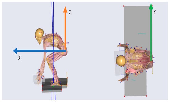 The L5-S1 compression and shear forces, flexion, lateral bending, and rotation angles and the distance between the joint and the box on the X, Y, and Z axes were determined. These variables were measured in units of Newtons (N), degrees (°), and meters (m), respectively. The distance from the center of the L5-S1 joint was measured as indicated in Figure 3. The figure displays an example with the following coordinates: (X1, Z1, Y1) = (0.73, −0.31, −0.01), with X1 = 0.73 m for the box in front of the sacrum, Z1 = 0.31 m for the box under the sacrum, and Y1 = 0.01 m for the box to the left of the sacrum.