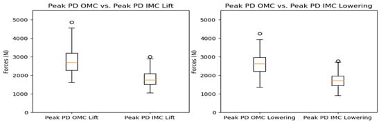 The compressive force estimates varied significantly between systems. The OMC results were, on average, 34% higher than the IMC estimates. Figure 5 shows the resultant box plots with the force estimates, where the difference increased as the observed forces increased. The KDE plots display the distribution of observations, shown in Figure 6. Due to the comparison of distribution shapes, it is noticeable that the OMC estimates showed a wider range of values than the IMC estimates for both the lifting and lowering scenarios. Figure 7 presents the Bland–Altman plots, highlighting a trend wherein increases in the magnitude of the force estimates increased the differences in agreement between the systems.