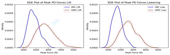 KDE plots for peak compressive force for the OMC and IMC systems for the lifting (left) and lowering (right) tasks.