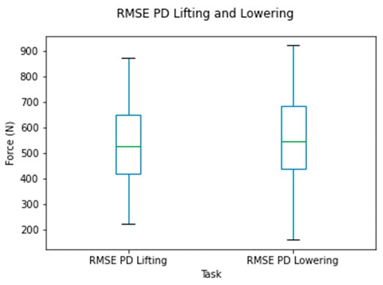 The RMSE of the compressive forces for the time series data for all observations is shown in Figure 9. The RMSE varied mainly between 420 and 756 N (from the 25th to 90th percentiles) for the lifting and lowering tasks.