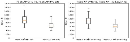 The biomechanical assessment was performed using the musculoskeletal modeling software Anybody™ V.7.3.1 (AnyBody Technology, Aalborg, Denmark). The OMC-based template used for the analysis was the Plug-in-Gait-MultiTrial-Standing set. For the IMC system, the template used was BVH_Xsens. The models were scaled according to the manually measured segment dimensions, which were inputted into the IMC software (v 2019.2) before initiating the data collection sessions. The BVH files from the IMC software were exported, containing information on the kinematic model static pose and the absolute position and orientation of the root pelvis segment as well as the joint angles between the segments for each time frame [42]. The Anybody Model Repository (AMR) used in this study to process BVH files was AMR v2.3.1. The compressive (proximo-distal (PD)) and shear (antero-posterior (AP)) forces were considered for the analysis. Medio-lateral (ML) shear forces were not considered due to their difference and smaller magnitude compared with the other two forces [43]. The load lifted (box) was modeled in the software using the distance between the hands and the dimensions of the box as references, with the dimensions of the actual box being lifted being 10 cm height, 25 cm width, 40 cm length.