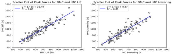 Scatter plots for OMC and IMC systems’ peak compressive force estimates for the lifting (left) and lowering (right) tasks.