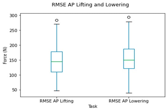 The RMSE of the shear forces for the time series data for all observations is shown in Figure 15. The RMSE varied mainly between 109 and 225 N (25th to 90th percentiles) for the lifting and lowering tasks, respectively.