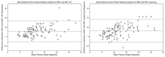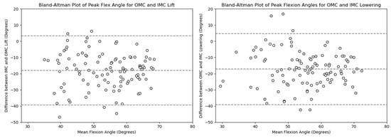 Bland–Altman plots for the OMC and IMC system peak flexion angle estimates for the lifting (left) and lowering (right) tasks.