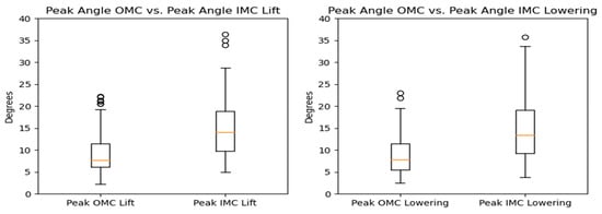 Box plots of the peak rotation angle for the OMC and IMC systems for the lifting and lowering tasks. Circles represent outliers.