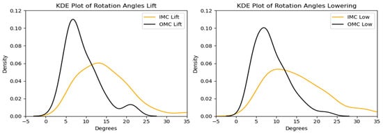 KDE plots for the peak rotation angle for the OMC and IMC systems for the lifting (left) and lowering (right) tasks.