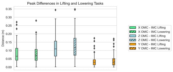 The peak flexion angle comparison for every system showed that the OMC-based estimates were higher than the IMC-based ones by around 14–18 degrees. Figure 16 and Figure 17 display the differences observed. Figure 18 shows the Bland–Altman plots, where it is displayed that the mean differences were 17.9 and 17.1 degrees for the lifting and the lowering tasks, respectively.