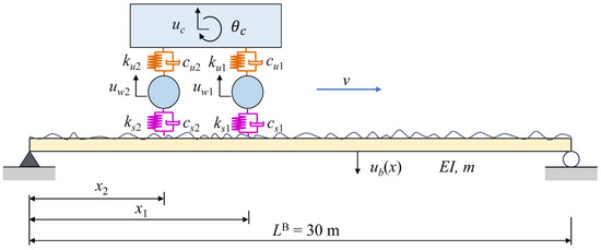 In this section, the feasibility and accuracy of the proposed subspace identification method are verified by numerical tests for a simply supported bridge. The numerically calculated vehicle–bridge interaction model is shown in Figure 3. Table 1 and Table 2 are the parameters and dynamic characteristics of the test vehicle and bridge, respectively. At the same time, in order to reveal the advantages of the proposed subspace identification method compared with conventional SSI in driving speeds, the experiment is set up with four working conditions of vehicle speed, v = 10 m/s (36 km/h), 20 m/s (72 km/h), 30 m/s (108 km/h), and 40 m/s (144 km/h), and the corresponding dimensionless speed parameters are Sv1 = 0.042, 0.085, 0.127 and 0.170, respectively.