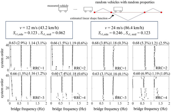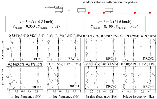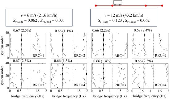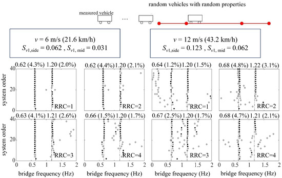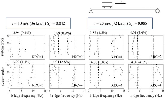 Figure 11 and Figure 12 represent the identification results using ST-SSI and the MOESP considering random traffic, respectively. The ST-SSI method succeeds in the identification of the first two bridge frequencies for all cases when the dimensionless vehicle speeds are small (Sv1 < 0.1). On the other hand, for higher speed situations (Sv1 ≥ 0.1), most of the first two frequencies can be identified effectively by the MOESP. It should be noted that, for the MOESP, the first-order identified frequency error is relatively obvious when the roughness of the road surface is particularly poor (RRC = 4). Compared with the identification effect via only one vehicle previously, the results indicate that sufficient excitation, including random vibration, is of great significance for bridge modal identification, especially for higher-order modal identification. Multi-point excitations from random traffic offer effective means for activating multi-order modal vibrations of the bridge for identification. It can be concluded that considering that continuous vehicles can better amplify the vibration of the bridge and stimulate the higher-order frequency vibration of the bridge to a certain extent, it is more beneficial for the indirect identification of the bridge frequency. Furthermore, the identification effect of the MOESP still outperforms that of ST-SSI at the speed of 12 m/s, with the clearer and more stable stabilization diagrams displayed by Figure 12. These results are consistent with those obtained by using a single vehicle, showing that the impact of time variation on ST-SSI is gradually marked at this point.
