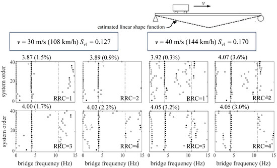 Furthermore, dimensionless velocities are used for evaluating the dynamic properties of a bridge. The ST-SSI method can be applied to the output signal of the system when the dimensionless speed is low, , where represents the fundamental frequency of the bridge.