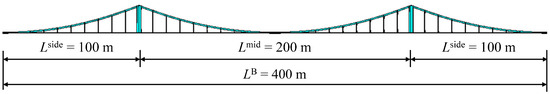 where , , and are the mass, damping, and stiffness matrices of the bridge/vehicle, respectively. and are the displacement vectors of the bridge and vehicle, respectively, with . is the external force taking into consideration the weight of the vehicle. and are the direction matrices connecting the position and the direction of the contact forces with the DOFs of the bridge and the wheels, respectively. represents the position of the wheel. is composed of the equation of shape function [42], and is of a matrix of 0 and 1: