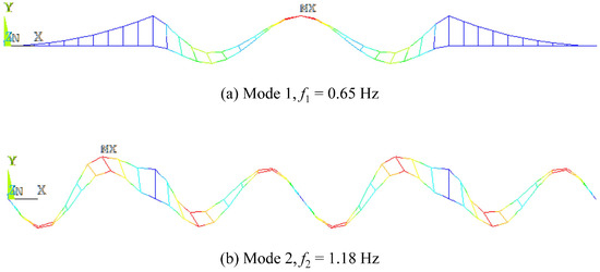 As a case in point to delve into the subspace identification method for large and complex bridges, this section validates the subspace identification for a suspension bridge using the realistic two-axle MDOF vehicle model as the traffic load, with the vehicle properties shown in Table 1 (Section 3.1). The finite element model of the suspension bridge is constructed with the aid of ANSYS, as is shown in Figure 6. Figure 7 displays the results of the first- and second-order modal analysis of the bridge, with its first and second order frequencies being 0.65 Hz and 1.18 Hz, respectively. Table 3 (Section 3.2) shows the properties of the target suspension bridge. The study conducts a numerical calculation of the VBI analysis to replace the actual measurement to acquire the vehicle response as the input signal for the subspace methods for subsequent identification.