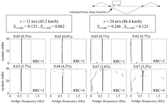 Figure 8 shows the bridge frequencies extracted from a single vehicle traversing at relatively low speeds (v = 6 m/s, 12 m/s) over the suspension bridge utilizing the ST-SSI. In the meanwhile, Figure 9 represents the identified results by the MOESP at higher driving speeds (v = 12 m/s, 24 m/s). The subspace identification, including both ST-SSI and the MOESP, succeeds in all cases for the fundamental frequency estimation of the bridge, even considering high levels of RRCs. For ST-SSI, the identification effect of the first frequency is clearer and more stable with lower driving speeds and weakens with the deterioration of pavement conditions. It is worth noting that the stability of the MOESP results at the speed of 12 m/s is better than that of the ST-SSI, a situation that could potentially be explained by the value of the dimensionless speed, which is larger than 0.1 for the side span at this point. When the dimensionless speed of the vehicle exceeds this value, the time-varying characteristic of the system does not satisfy the “static” premise assumption of the ST-SSI. On the contrary, the time variation caused by the increase in vehicle speed fits with the assumption of the MOESP, so it is applicable to this case. In addition, it should be noted that there is no indication of any signs of higher-order frequency identification for either the ST-SSI or the MOESP methods. Hence, the excitation from only a single vehicle to the bridge is likely insufficient to activate the higher-order vibration of the bridge. To get this point right, more traffic loads are needed to yield more significant excitations against the bridge.