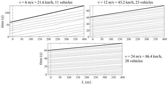 In order to better stimulate the higher-order vibration modes of the bridge, the study applies two subspace identification methods to a more realistic scenario considering the surrounding random traffic flow. Therefore, a Cellular Automation (CA) model is taken to yield the random traffic flow of the bridge, with a moderate flow of service level based on the range of traffic occupancy classified in the highway capacity manual considered [46]. Additionally, the study assigns random parameters to these vehicles, considering weights approximately from 1500 kg to 3000 kg, fundamental frequencies from 1.5 Hz to 3.5 Hz, and a similar damping ratio to the last (measured) vehicle. Figure 10 shows the random traffic paths at three different speeds.