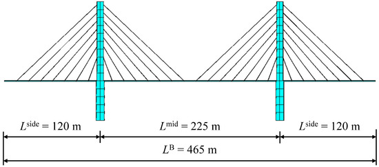 To further verify and enforce the above conclusions, this section discusses the application of the subspace identification to a long-span cable-stayed bridge considering random traffic. The bridge is also established by ANSYS, as is shown in Figure 13. The results of the first- and second-order modal analysis of the cable-stayed bridge are shown in Figure 14. Table 4 represents the characteristics of the bridge. Firstly, the VBI kinematic equation is used to calculate and solve the vehicle response. At the same time, considering three cases of vehicle speed, v = 3 m/s, 6 m/s, and 12 m/s, the corresponding dimensionless velocity parameters are as follows: side span Sv1,side = 0.050, 0.100, and 0.200 and middle span Sv1,mid = 0.027, 0.054, and 0.107. In this experiment, the parameters of the measured vehicle are shown in Table 1. Similar to Section 3.2.2, the random vehicles simulate a normal traffic flow under the bridge service state, and the random vehicle parameters were also randomly assigned, with the vehicle weight being random, from 1500 kg to 3000 kg, the first-order frequency being random, from 1.5 Hz to 3.5 Hz, and the damping ratio being similar to that of the last (measured) vehicle. Before the measured vehicle enters the bridge, a one-minute random vehicle simulation is carried out. Figure 15 shows the driving paths of random vehicles at different vehicle speeds, where the thick black line represents the measured vehicle.