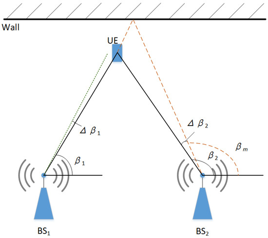 The AOA positioning technique utilizes the built-in antenna array at the receiving end of the base station, denoted as BSi, to capture the azimuthal angle of the electromagnetic wave transmitted from the user terminal (). This information is used to formulate the tangent function equation, as depicted in Figure 1. The coordinates of the base station are , the coordinates of the base station are , and the coordinates of are . Without considering the noise and the multipath influence, the measured angle of arrival of the base station is , and the angle of arrival of the base station is , which can be obtained by the trigonometric function Equation (1):