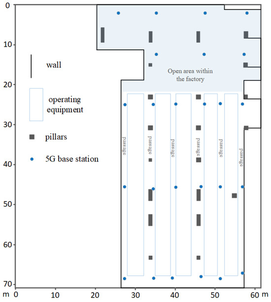 Schematic plan of the plant workspace; the blue point is the 5G base station. All areas are within the factory’s working space. The light-blue area represents the open space inside the factory. The blue rectangle below indicates operational equipment, with an aisle in the middle for pedestrian passage.