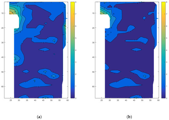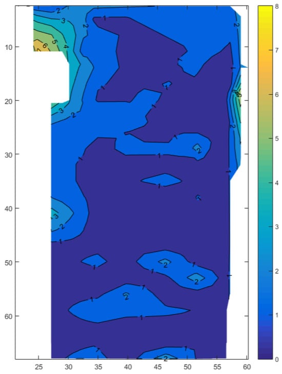 We calculate the Euclidean distance as the measurement error according to the real coordinates and the measured coordinates in the dataset and obtain the error contour map of the indoor working area as shown in Figure 3. Figure 3 shows the 2D positioning results, where the horizontal and vertical axes represent the true coordinates inside the factory. The contour lines in the figure indicate the error values of the measured coordinates at corresponding positions.