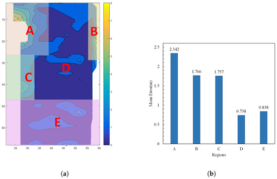Schematic diagram of partitions and bar chart of average errors. (a) Schematic diagram of work area zones. The regions labeled A–E represent five distinct areas delineated in the study. (b) Bar chart of average errors in each region.