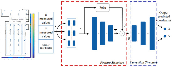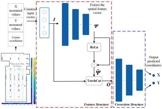 As shown in Figure 5, the structure within the red dashed box of model A is the spatial signal feature extraction structure. The input tensor is the constructed input tensor . The three rounded rectangular bars represent hidden layers constructed by neurons, and the neurons in multiple hidden layers are interconnected to form a neural network structure used to extract the spatial feature tensor . The tensor , obtained through residual propagation, is fused with tensor to construct tensor through tensor fusion. Tensor , serving as the input tensor fused with spatial signal features and error information, is passed into the error correction structure. The error correction model fits the spatial signal features and error information, outputting the corrected coordinates. As shown in Equation (12), where g(x) represents the correction effect of the correction structure.