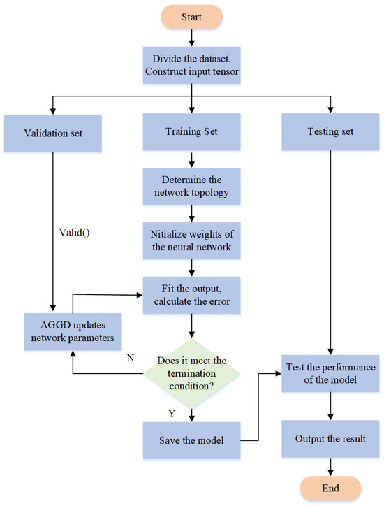 Firstly, the dataset is randomly shuffled, and 20% is randomly selected as the test set, 20% as the validation set, and 60% as the training set. The training set is used for model training. During the training process, the model’s network topology is determined, the neural network weights are initialized, and then the iterative training process begins. In each epoch, the pre-built model predicts output results, compares them with the ground truth to calculate the output loss. The training continues until the termination conditions are met. The AGGD algorithm is employed to update network parameters, with the validation set used to verify the model’s performance and prevent overfitting. Once the termination conditions are met, the trained model is saved, and the test set is used to evaluate the model’s performance, producing the test results.