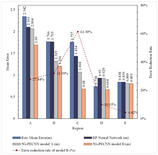 As shown in Table 1 and Figure 9, model B achieved significant error correction effects in areas A, B, and C. The error reduction rates are 27.84%, 31.99%, and 61.30%, respectively. For regions D and E, which originally had smaller average errors, model B also achieved some correction effects without expanding the errors. Constrained by the inherent performance of 5G signals in achieving positioning accuracy, the positioning accuracy corrected by the 5G-PECNN constructed by model B is already sufficiently excellent.