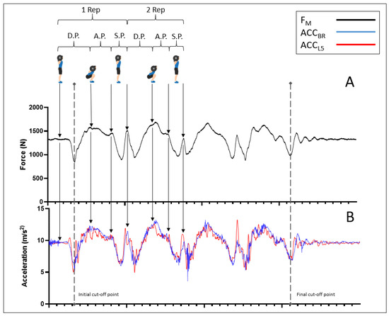 Example of a set of four squats showing the kinetic and kinematic dynamics during the intensity of 70% of the repetition maximum. Illustrated here are the synchronized force and acceleration profiles. The upper graph (A) shows the force magnitude (FM, in Newton), represented by the solid black line. The lower graph (B) displays the acceleration magnitude (m/s2), with the blue line representing acceleration at the barbell (ACCBR) and the red line indicating acceleration at the lumbar region (ACCL5). Dashed vertical lines represent the initial and final cut-off points for data analysis. The phases of the squat movement—ascending (A.P.), descending (D.P.), and stabilization (S.P.)—dotted arrows indicate phase changes approximately. These arrows also relate the graph of FM to that of acceleration in ACCBR and ACCL5. Additionally, icons at the top illustrate key positions within the squat cycle: standing and the lowest squat point.