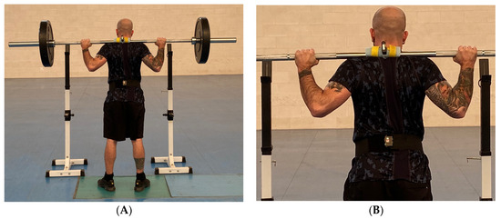 A linear encoder T-ForceTM (T-Force Dynamic Measurement System, Ergotech, Murcia, Spain) was used to calculate RM and monitor mean propulsive velocity during repetitions. During the experimental protocol, the force data were obtained using a Kistler force platform (Winterthur, Switzerland, Mode 9287BA), which was calibrated with InstaCal software V. 7.62 (Measurement Computing Corporation, Norton, MA, USA) before the start of the protocol. The acceleration signal was obtained through two IMUs, which formed part of an inertial motion capture system (iSen, STT Systems Inc., San Sebastián, Spain). One of them was placed in the middle of the barbell with which squats were performed, and the other was placed in the lumbar region at the level of the lumbar vertebra 5 (L5) (Figure 2). The IMUs were synchronized with the iSen software, V. 2023.0. Synchronization between the force platform and the accelerometers was achieved by means of a trigger. The trigger was made by hitting the force platform with an IMU used exclusively for this purpose. Both the IMUs and the force platform recorded at a frequency of 200 Hz.