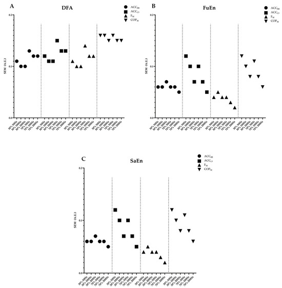 Results of standard errors of measurement by variables: (A) detrended fluctuation analysis; (B) fuzzy entropy; (C) sample entropy. The dashed lines indicate the groupings of the different devices. Note that the SEM standard deviation is not shown in the graphs because given the differences in the measurement magnitudes of each device they are not comparable.