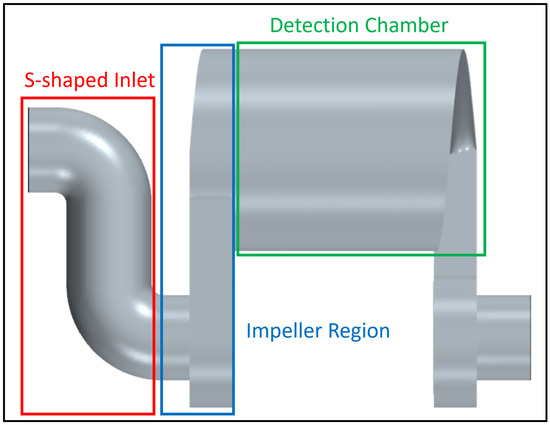 The rate of strain tensor L is recorded for each region as shown in Figure 2, from which is derived. Regions of interest are the S-shaped inlet, the area around the pump impeller, and the detection chamber. The size of the impeller region is extended upwards and leftwards of the impeller itself to capture the rates of strain immediately before and after the impeller.