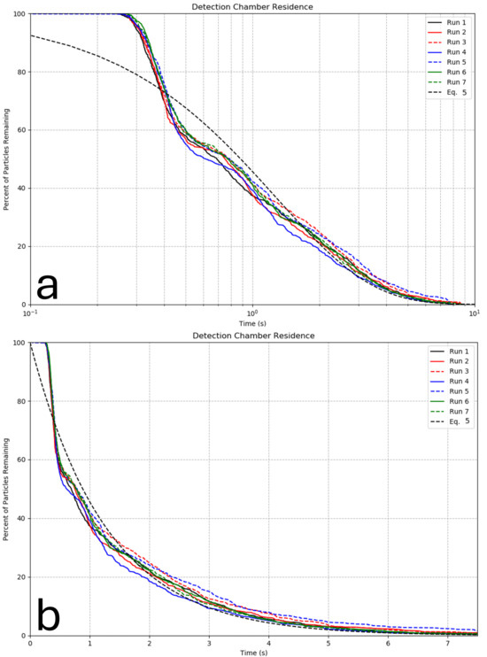 Distribution of particles remaining in the detection chamber over time for the runs in Table 1 and from Equation (5): The x-axis represents the time particles have spent in the detection chamber (a) on a logarithmic scale and (b) on a linear scale. The y-axis represents the percent of particles remaining in the detection chamber.