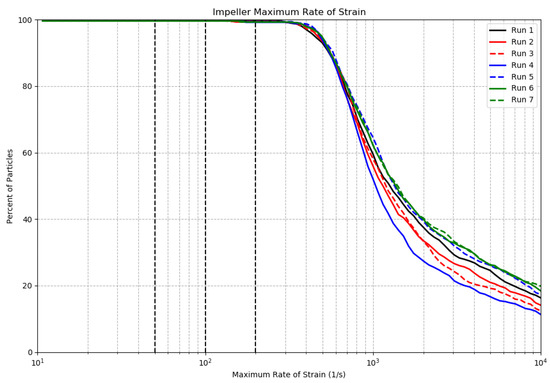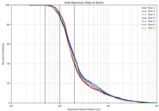 Numerous studies have been conducted to determine the rate of strain required to stimulate bioluminescence in different taxa [12,17,18]. These studies found that the rate of strain required for stimulation in steady laminar flow varies between 20 and 300 . For the runs in Table 1, Figure 4 plots the percent of particles stimulated in the S-shaped inlet as a function of the threshold rate of strain to cause that stimulation. Figure 5 and Figure 6 present similar estimations for the detection chamber and the pump impeller, respectively. Table 3 presents the percent of particles experiencing rates of strain exceeding 50, 100, and 200 in the inlet and in the detection chamber.