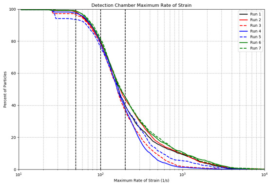 For low rates of strain (below 50 ), Run 3 and Run 5 deviated from the baseline run. Analysis of particle paths (not shown here), demonstrated that this discrepancy can be attributed to particles that settle in the detection chamber, with the percent of particles settling proportional to the mass of the particles. Rate of strain plots in all regions show that some particles experience very high rates of strain, in some cases well over 1000 . This can be attributed to the interaction of a small percentage of the particles with the boundary layer in each region, where strain is very high compared to the surrounding flow due to the considerable velocity gradient near the wall.