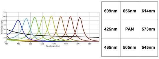 Arrangement of spectral bands in SFA pattern of SILIOS CMS-C sensor as well as transmission and wavelengths of spectral bands of each filter. Reproduced from [29,30,31].