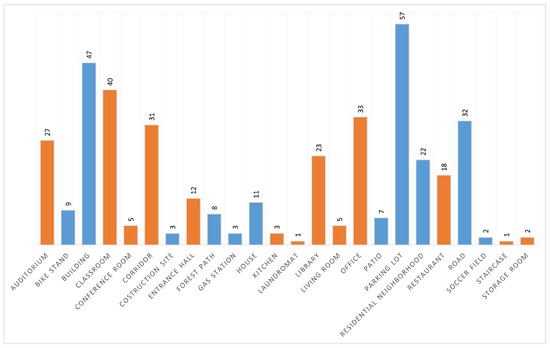 All scene categories and their sizes in our raw SFA scene recognition dataset. Blue color means outdoor scene and orange color means indoor scene.