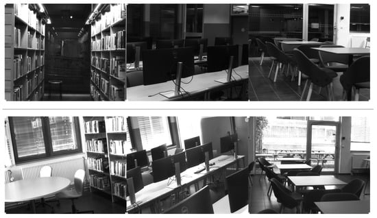 Images of library, office, and restaurant classes were captured under varying lighting conditions. These classes have high dynamic range conditions with daylight entering through the windows, while the camera is exposed to the indoor light level. The dataset also contains images captured at night in artificial lighting. Examples of these images are shown in Figure 4.