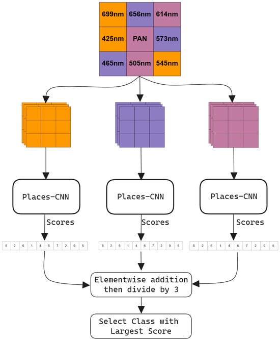 This section covers the details of the proposed method for classifying scenes in raw SFA images. The proposed model is based on Places-CNN [20]. The model is not trained on the raw SFA dataset; instead, the pretrained weights of the Places-CNN are used. For details of the Places-CNN training methodology, we refer to [20]. Places-CNN is trained on RGB images of the Places dataset [21] so it cannot be used readily with the raw SFA images, which consist of one channel. We introduce a three-pathway network which accepts three pseudo-RGB images, performs inference on each image independently, and finally combines the Softmax probability scores. The three RGB images are obtained from the 9-band raw SFA image. This scheme enables full utilization of the spectral information. Considering the raw SFA to be a grayscale image reformulates the problem and shifts the multispectral aspect to be implicit in the model. It also makes the model applicable to any nine-channel multispectral camera. We selected three bands from the 3 × 3 filter array to create a 3-channel pixel in the pseudo-RGB image. Figure 5 shows the selected bands that form the pseudo-RGB pixels in each of the three pseudo-RGB images. These bands were selected based on their wavelengths that correspond to the red, green, and blue colors in the visible wavelength range. One exception is that the panchromatic band is assigned to the B channel in the pseudo-RGB 3 image. It was assigned because it was left over after all other bands were selected. Figure 6 shows an example of these three pseudo-RGB images. These pseudo-RGB images have a resolution of 427 × 342, while the original raw SFA is 1280 × 1024.