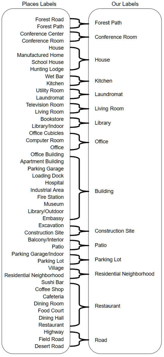 The Places dataset on which Places-CNN is trained contains 365 fine-grained classes. It includes specific classes such as apartment building, office building, hospital, etc. Our dataset has 24 general classes, including those that do not exist in Places (bike stand). Therefore, it encapsulates all buildings in the building class that does not exist in the Places dataset. To solve this mismatch, a label mapping is performed before combining the scores. So, all specific classes are replaced with general classes that exist inside our dataset, and their scores are summed. All Places dataset labels are analyzed, and the visually and semantically similar classes are mapped to the general class label in our dataset. Figure 8 shows all the label mappings from the Places dataset labels to the labels of our dataset.