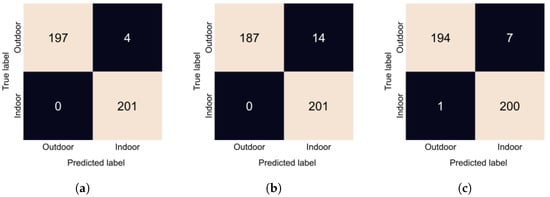 Confusion matrices of the indoor vs outdoor classification task. (a): Confusion matrix of Configuration 1. (b): Confusion matrix of Configuration 4. (c): Confusion matrix of Configuration 6.