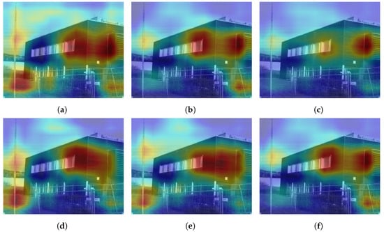 Class activation maps of a building image correctly classified by all configurations. (a) Configuration 1. (b) Configuration 2. (c) Configuration 3. (d) Configuration 4. (e) Configuration 5. (f) Configuration 6.