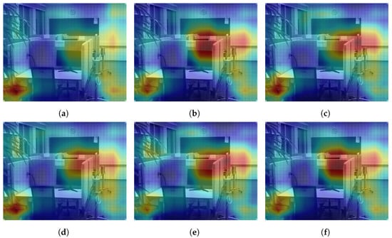 Class activation maps of an office image correctly classified by all configurations. (a) Configuration 1. (b) Configuration 2. (c) Configuration 3. (d) Configuration 4. (e) Configuration 5. (f) Configuration 6.