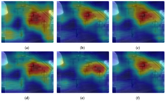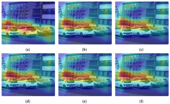 Class activation maps of a parking lot image incorrectly classified as building by all configurations. (a) Configuration 1. (b) Configuration 2. (c) Configuration 3. (d) Configuration 4. (e) Configuration 5. (f) Configuration 6.